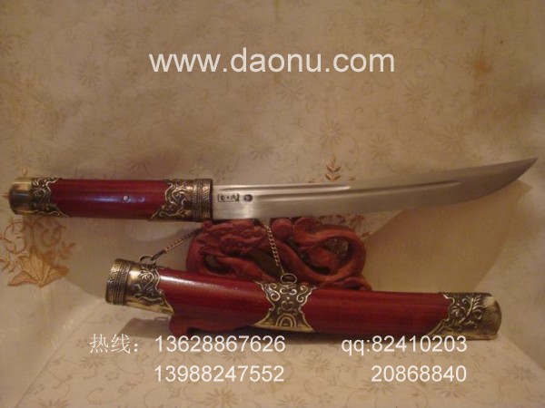 商品介绍: 此刀经过户撒优秀匠人全手工精锻而成,刀身材料为优质军用高碳锰钢或进口车弹簧板,采用古老的户撒刀锻打工艺,刃口经千锤百炼后配方淬火热处理而成,经典小苗刀刀型,刀刃流线优美,刃口刚火极好,粗锋可砍铁不伤,细锋可轻松剃毛,刀柄刀鞘用名贵大叶紫檀制作而成,精选好料,颜色深红华贵,刀鞘精包缅银,经典民族收藏。大家莫失时机!