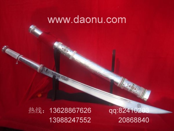 此宝刀是户撒民族传统款式,此类刀具也是阿昌、景颇、傣等民族最喜爱的一种传统刀式,每逢节日或家有喜事成年男子必要佩戴,以示庆贺;更因做工精细,外观精美,早已成为馈赠与收藏的贵重民族手工艺品,深受大家喜爱!其市场价格高昂。鉴赏要点:此刀纯银刀装,刀装采用99纯银皮手工雕刻制作,刀鞘用银完全不计工本,包厚银(大家注意此刀装上雕龙,如果银用的少了那条龙是没法雕的)此刀用银在8.4两(当地一两为37克)。纯银所包木料也是名贵缅甸红酸枝,这点也有别于其他家所制银刀,刀条采用乔发精选军用弹簧钢打制而成,为传统苗刀和平头刀样式(非户撒普通银刀,普通银刀刀条宽度仅为3厘米左右),刃口坚硬,可砍铁过竹,刀鞘手感沉重,市场价格高仰,(比赛收藏级可砍铁过竹)