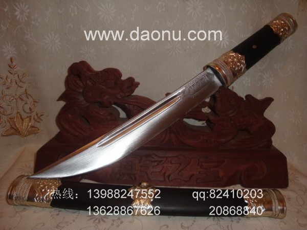 商品介绍: 此刀为户撒刀锻打工艺嫡派传人名匠线乔发全手工精心打制,刀身采用优质军用弹簧钢,用户撒刀古老传统锻打方法,经千锤百炼后配方淬火热处理而成,经典小苗刀刀型,刀刃线条流畅美观,刚柔相济,粗锋可砍铁不伤,细锋可轻松剃毛,刀柄刀鞘为精选天然珍稀黑檀木,精选老料,刀鞘精包亮色缅银,经典民族收藏。手工刀爱好者莫失良机!