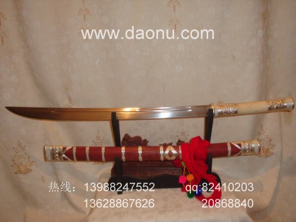 商品介绍: 此刀户撒刀名匠黎有兴(其作品2007年参加大王大赛获得刀王称号)精心打制而成,此刀刀身采用优质军用弹簧钢,传统锻打方法精锻而成,刀型为传统民族苗刀刀型,作品经千锤百炼后配方淬火热处理而成,其刀刃流畅,刃口淬火硬度高,刀背硬度相对低,以达到刚柔相济之美,此刀磨锋利后可轻松过竹,粗锋可砍铁不伤。刀柄刀鞘为精选天然珍稀黑大叶紫檀(也成为缅红),刀柄为野生麂子角!并刀鞘精包缅银,民族请大家抓紧时机定制。