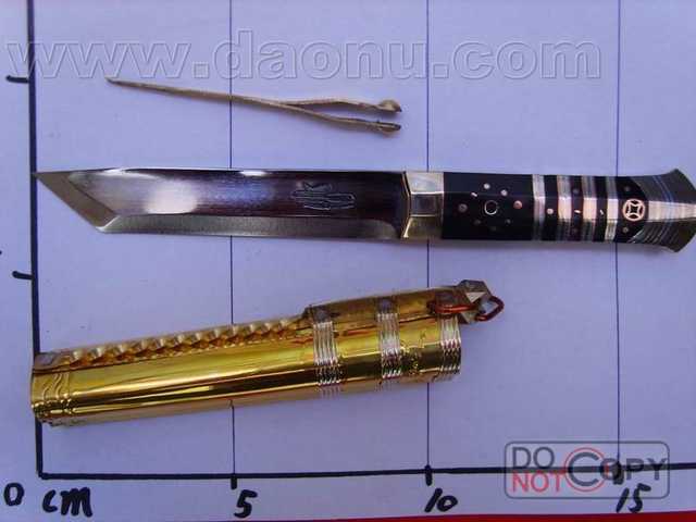 刀面上刻有七颗星、五朵梅、一条龙、一把手等图纹,纹饰精细;刀柄由红、黄铜片和铝片、牛角等材料叠合铆成,打磨后色泽艳丽,犹如彩锦;刀鞘多为铁鞘铜箍,配以装插的钢制镊子,既增添了刀鞘式样的美观,又可以防止刀体从鞘中滑出。