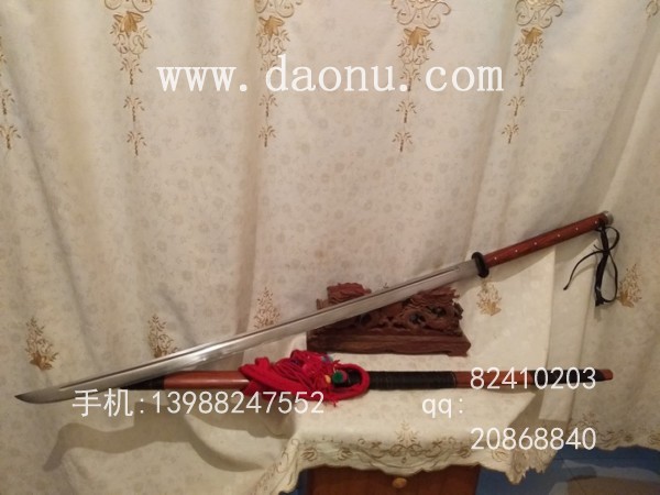 商品说明:此刀为被列为户撒刀省级非物质文化传承人的杨茂芳纯手工精心锻打而成,定制此刀客户为练习传功苗刀套路的武术人士,刀条为经典沧州苗刀款式,刀条修长,锻打工整,威力无比!其刃材为精挑军用弹簧钢(高碳锰钢),刀条经过匠人千锤百炼后独特配方淬火工艺而成,整刀刚柔相济,刀背软刃口硬,粗锋轻松砍铁,挥砍威力惊人,一刀在手令敌人胆寒!刀条性能极佳,过竹砍铁威力无比!刀柄尾端手工加钢,增加锤击作用。刀条锻造工整线条流畅,刀鞘刀柄为精选缅甸红酸枝木缠棕而成,民族气息浓郁,简洁耐用!深为武林人士所钟爱,是收藏户撒刀的不二经典刀款,定做工期25-30天!