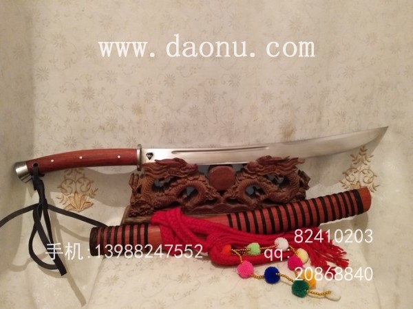 商品介绍:此刀由本站投资商独家进口的高档进口钢材纯手工锻打而成,相对于其他钢材,此种钢材硬度和防锈能力更为提高,可以达到刮毛而砍铁不伤的性能指标,因钢材硬锻打难度和特殊淬火技术要求更高,因此产量有限,此刀经典民族款苗刀造型,刀身流畅美观,刀条一体全龙骨设计,坚固耐用!尾端手工加钢,户外可做敲击使用,刀条特殊锻制千锤百炼而成,刃口坚硬,防锈能力出众,手感一流!刀鞘刀柄精选缅甸老红酸枝,外缠综丝而成,民族风格浓郁!大家抓紧时间订购。
