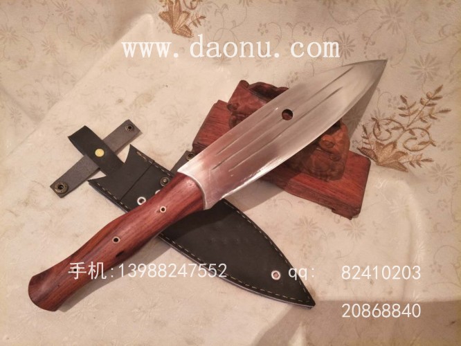 商品介绍:此刀造型按照著名美国秃鹰 Condor 生存刀款式,刀身材料为精选高碳锰钢,工艺为传统户撒刀锻打传承工艺,传统配方淬火,刚柔相济,刃口钢性十足,粗锋砍铁不伤,细锋轻松刮毛,刀柄全龙骨设计,结实耐用!此刀为经典户外款式,刀身相对轻薄,户外省力,刀尖薄化处理,可以户外钻孔使用,刀鞘为牛皮手工缝制,便携耐用!价格600元,为美国原产的三分之一,性能却绝对不输,欢迎大家定制!
