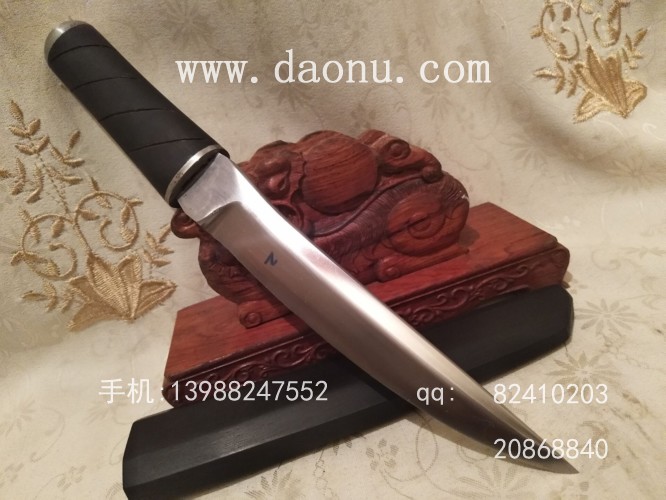 商品介绍:此刀原型为台湾铸刀名匠陈朝波为美国海豹突击队设计和制作的必杀刃,此刀转为一击必杀而生,造型犀利、拔刀迅速,整刀没有任何多余之处!本站制作的此款必杀格斗刀采用精挑进口弹簧钢纯手工锻打制作而成,刃口刀尖经过户撒独有的配方热处理,刃口坚硬,人工冷磨后可轻松刮腿毛,刺穿铁皮桶轻松不费力!采用两种刀鞘一种为随身便携的牛皮刀鞘,一种为传统快插式黑檀木手工刀鞘,既方便外出携带方便又可摆放家中把玩,但是不建议用刺刀防身使用,因为危险性太大,轻易的穿刺功能会给对方造成很大的人身伤害甚至死亡,把玩和收藏即可!