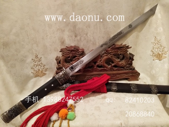此刀唐刀造型,刀身雕刻龙凤,配优质黑檀刀鞘外包缅银配饰,看到的朋友都非常喜欢,它就是一把冷兵器,把您带到硝烟四起的古代...,刀条采用优质高弹锰钢,硬度方面要略强于最早出品的百炼花纹钢.