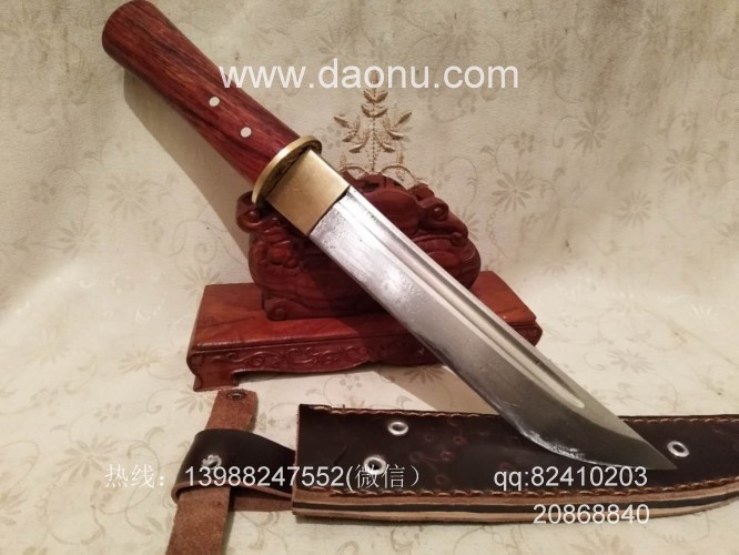 商品详情:此刀为被列为云南省级非物质文化传承人的著名刀匠杨茂芳全手工锻打制作,刀条钢材为精选高碳锰钢,刀条千锤百炼而成,刃口局部淬火,刀条采用手工平磨,切割更为顺畅,独到的淬火方式使得刀条刚柔相济,粗锋砍铁不伤,细锋的话可达到轻松刮毛,配手工缝制的牛皮鞘,更加便携,刀柄为优质红酸枝贴合手型制作,握感舒适。此刀户外车载防身皆可,欢迎大家订购!