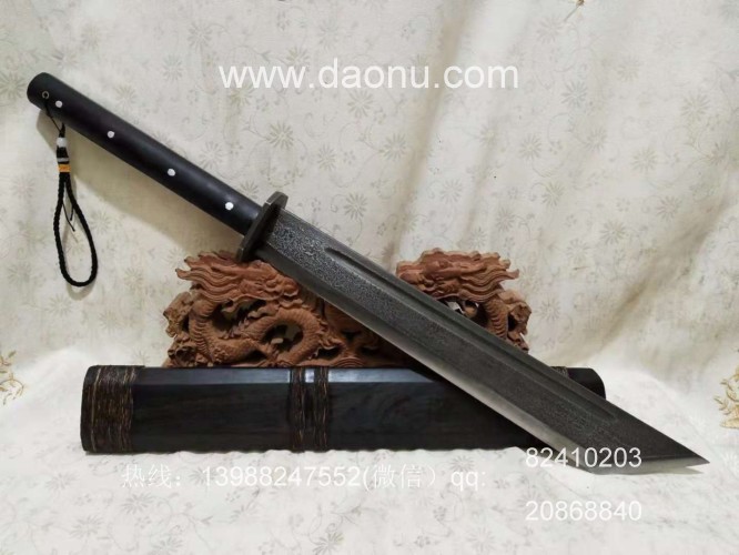 商品描述:此刀由户撒优秀刀匠,户撒刀锻造名匠黎有兴师弟(锻打技术高超,除雕花技术外,其刀条工整度,钢火等方面已和名匠线乔发比肩)亲手锻造,钢材为精选百炼花纹钢,硬度和韧性具优!纯手工千锤百炼后配方淬火而成,刀条刚柔相济,可以砍断钢筋不伤刃口,刀型粗犷厚重,一体全龙骨刀条,坚不可摧,此刀手感沉重威力极大!刀柄和刀鞘为优选非洲黑檀木手工制作,低调奢华,又有浓郁民族风格,收藏、镇宅、实用俱佳!