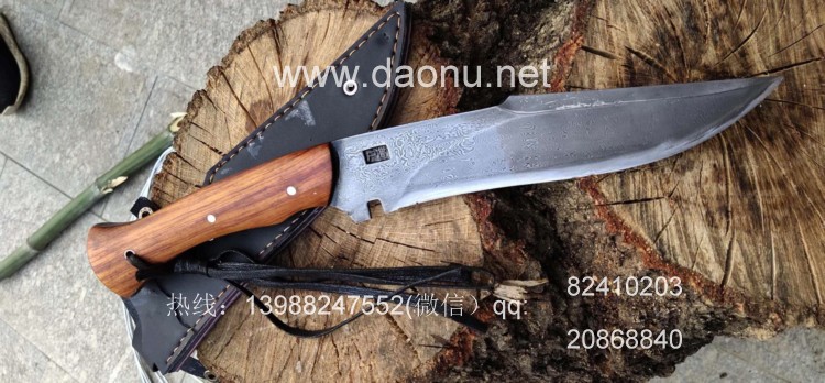 户撒刀简介:此刀精选特硬高碳锰钢由户撒优秀锻打全手工锻造而成,刀身千锤百炼后匠人独特配方淬火而成,此刀性能卓越,刚柔相济,刃口粗锋砍铁不伤,细锋轻松刮毛!刀体采用世界大名鼎鼎的博依刀外形,此刀配重极好,手感舒适,因此劈砍相当有力!户外穿刺能力也极强,因此这款刀拥有众多狂热刀迷得追捧,更获得了户外驴友非常青睐。此刀手柄采用优质红酸枝贴片,防开裂性能极佳,手感舒适!刀鞘采用牛皮刀鞘(独家设置防潮夹层)。480元!欢迎大家来电或者微信咨询详谈!微信13988247552