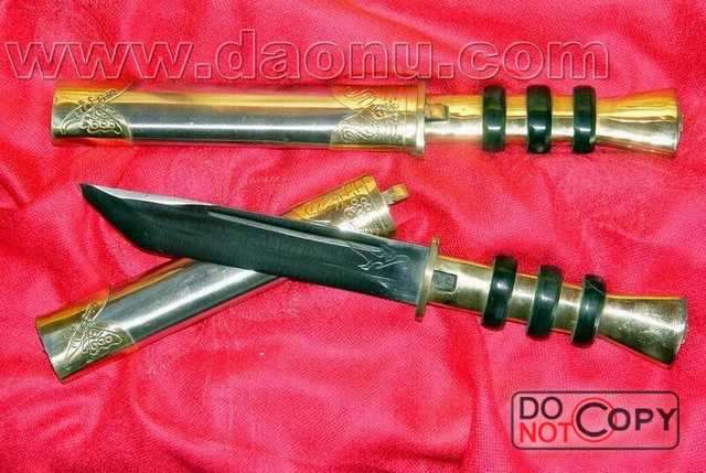 工序简介:刀刃,加钢,刀刃上刻有三环图案;刀柄由护手、秫秫、珠子(落巴)、盖噶等组成,所用原料有:精选牛角、红铜、黄铜、铁等。刀鞘由铜皮做成,照样板裁下后,经手工卷、拷、焊(银焊)、揎、磨光,完了要钉秫秫、环子,最后插进用手削好的木鞘。