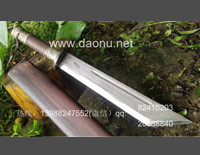 户撒刀简介:此刀由户撒优秀刀匠项老赛大徒弟全手工锻造,刀条采用优质百炼花纹钢千锤百炼配方淬火而成,刃口硬度极高,轻松砍钢筋不伤刃口,原始野性淋漓尽致!一体全龙骨结构结实耐用,刀型采用电视剧大刀主人公郑羽所持大刀作为原型,因为本站早期已推出长款,定做客户供不应求,此次为郑羽大刀缩小版,主要比老版突出便携性,刀柄刀鞘为精选黑酸枝木手工制作,手感极好!此刀重量相对老版更轻,方便日常练习或者随车携带,制作工期20天左右。