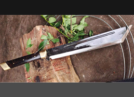 户撒刀简介:此刀为户撒优秀刀匠精选优质高弹锰钢全手工锻打的户外大威力开山刀,一体全龙骨锻造,千锤百炼而后配方淬火而成,刚柔相济,刃口硬度高,斩钉截铁不在话下,导体表面进行黑处理,为煅烧黑面,具备了更好的隐蔽性,同时增加了刀体的防锈功能,刀柄精选优质黑檀,护手隔片为纯铜制作,有力量的朋友可以咨询选购。