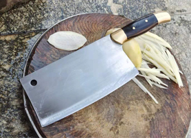 户撒刀简介:此菜刀为精选进口不锈钢!采用户撒传统锻造工艺反复锻打而成,刃口局部淬火,以达到刚柔相济作用,刃口采用人工冷磨以防刃口退火!并且采用不同目数的磨石依次打磨,达到锋利刮毛的锋利度,使用更加得心应手!刀柄采用上等非洲黑檀木手工制作,手柄前后两端手工镶嵌厚黄铜板,使得不仅手感舒适耐用,而且更上档次!此款菜刀刃长18厘米左右 宽度9厘米左右(全手工锻打数据会稍有变化)左右,菜刀极为锋利!为大厨设计用刀,达到可轻松剃毛过水瓶的锋利度,大厨切片非常好用!并且也符合绝大多数家庭用刀习惯,重要的是此款菜刀采用进口不锈钢锻造,不会生锈!!