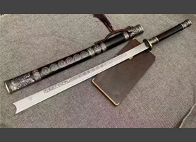 户撒刀简介:户撒精品花纹钢平头刀,平头刀是户撒阿昌族最为喜爱的一种刀型,此种款式配重合理非常便于日常使用,这款黑檀木花纹钢马刀,全手工花纹钢折叠煅打,锻打层次细腻,纹理美观独特,性能出众,做工精美,款式大气,古色古香,民族特色浓郁,进口黑檀木刀鞘,沉稳高端,复古铜加固,独特美观。 刀刃60厘米,全长90厘米,宽度3.6——4.5厘米,厚度0.9厘米,净重:1160g。特点:这把精品斩马刀性价比超强,刀刃锋利无比,可轻松削纸过草席,外观大气古朴,华贵沉稳,是不可多得的一把好刀,表演、收藏,送礼,镇宅,装饰,鉴赏绝佳之选,喜欢的朋友千万不要错过。
