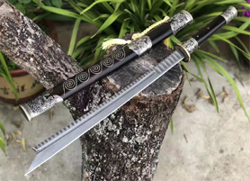户撒刀简介:户撒精品花纹钢斩马刀,刀中之霸,唯有斩马,斩马刀自古以来便是最为霸气的,无论性能还是外观,都是刀中的佼佼者。这款黑檀木花纹钢马刀,全手工花纹钢折叠煅打,锻打层次细腻,纹理美观独特,性能出众,斩铁截钉不在话下!做工精美,款式大气,古色古香,民族特色浓郁,进口黑檀木刀鞘,沉稳高端,复古铜加固,独特美观。 刀刃60厘米,全长90厘米,宽度3.6——4.5厘米,厚度0.9厘米,净重:1160g。特点:这把精品斩马刀性价比超强,外观大气古朴,华贵沉稳,是不可多得的一把好刀,表演、收藏,送礼,镇宅,装饰,鉴赏绝佳之选,喜欢的朋友千万不要错过。