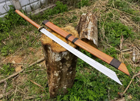户撒刀简介:此斩马刀为户撒刀王项老赛大徒弟精选高碳锰钢全手工锻打而成,刀型为刀中之霸斩马刀造型,一体全龙骨锻打刀条,结实耐用永不松动!刀条线条流畅,刃口刚柔相济,砍铁不伤!刀鞘刀柄为优质红酸枝手工制作,刀柄增加户撒工艺中非常独特的镶丝工艺,显得更加具有民族特色,并且更加精美!欢迎大家定做收藏!