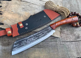 户撒刀简介:此款刀为优秀匠人采用轨道钢手工锻打而成,轨道钢经过手工锻打和淬火后性能极好,斩铁截钉不在话下,此刀长短和配重设计转为户外客户量身定做,刀身颜色为锻打黑色,户外不反光也能增加防锈能力,此款小砍刀为优质促销产品,大家抓紧时间购买!