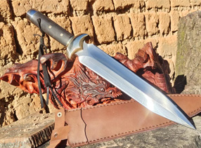 户撒刀简介:短剑采用性能极好的户撒红钢全手工锻打,一体全龙骨剑身,刀身千锤百炼后淬火而成,性能非常强悍,轻松砍铁,而且穿刺能力极佳,穿铁皮桶根本不用使劲,护手为实心纯铜纯手工磨制,整体做工效果非常精细紧致,尾端带击锤,户外做锤击使用,配高档手工缝制的牛皮刀鞘,收藏、实用、户外一体的好剑!
