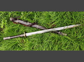 户撒刀简介:此剑为传统户撒宝剑经典款式,刃材为坦克销钉手工锻打,一体全龙骨锻造,此种材料钢性十足,再经过匠人精心锻打淬火而成,因此性能非常出色,斩铁截钉不在话下,手柄和剑鞘为精选黑檀木外包缅因手工制作,和剑身搭配显得古香古色韵味十足!