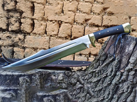 户撒刀简介:这款刀为重型开路型砍刀,看似不大,其实已经是一款不小的开山刀,刀型非常犀利美观,刀尖往后开有假刃,更增加了刀的户外穿刺能力,刀体采用军用车弹簧板手工锻打淬火而成,性能绝佳,因为刀体厚重所以劈砍能力极强,胳膊粗的树枝应声而断,护手和尾端采用实心黄铜制作,美观结实防锈能力也大大增强,这把刀手感沉重,适合力气的大的朋友使用。