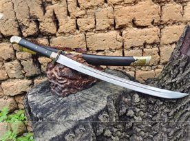 户撒刀简介:这款精工制作的清刀,刀条采用历史上赫赫有名的清刀为参照,户撒纯手工锻打工艺淬火完成,一体全龙骨刀体性能极佳,斩铁截钉不在话下!手柄尾端和护手为纯手工实心黄铜手工雕刻制作,做工精细扎实,浑然天成!刀鞘为优质黑檀木纯手工制作,整把刀线条流畅刀型完美非常具有观赏和收藏价值。