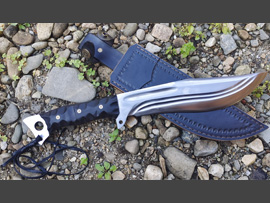 户撒刀简介:给客户订做的巴斯掠夺者!优质红钢手工锻打,美国著名户外刀款式,原品市场价格约为8500元人民币,按照客户要求采用我们户撒纯手工锻打工艺,880元定制,性能极佳!砍铁削纸不在话下!此刀刀型独特重心偏向刀头方向,因此户外劈砍性能一流,刃长25厘米左右 全长42厘米左右,手柄采用优质黑檀木,手工磨防滑凹槽,手感出众!