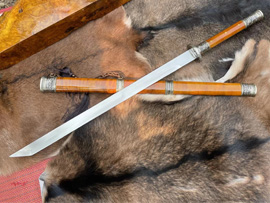 户撒刀简介:这把精品高档唐刀采用军用解放车弹簧板纯手工锻打,刀条经过匠人反复锻打和淬火后刀条性能极佳并能刚柔相济,刀型为经典唐刀款式,做工精美一丝不苟,刀鞘刀柄仍旧是皇家用料极品金丝楠木手工制成,美轮美奂!