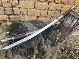 户撒刀简介:这是给客户定做的一款精品泰缅刀,刀条采用军用解放车弹簧板锻打,千锤百炼性能极佳!刀条修长秀气,刀身开宽血槽,更为美观抗造,刀鞘为有优质黑檀木手工制作,外包缅银,客户要求刀放在支点上能自动立起,并达到砍铁和锋利的特点。