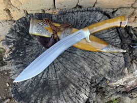 户撒刀简介:高端金丝楠尼泊尔刀,刀条采用户撒红钢手工锻打,性能极佳,砍铁不伤!尼泊尔刀这种款式的刀因为重心略微靠前因此非常适合户外劈砍,这把刀刃长32厘米左右,全长49厘米左右,刀鞘和刀柄采用极品金丝楠木手工制作,刀鞘外包缅银,使得这把刀除了实用特点外更具有皇室气质,非常适合收藏或者送礼!