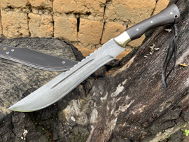 户撒刀简介:这款刀精选特硬百炼花纹钢手工锻打,设计刀头偏大,因此劈砍重心靠前,户外开山相当有力,刀条经过匠人千锤百炼后配方淬火而成,性能极佳,一体全龙骨锻造结实耐用!手柄为优质黑檀木,手感极佳,户外神器!