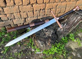 户撒刀简介:这是给客户加工好的一把剑中的巨无霸,一体全龙骨锻打!从业以来最大的一把剑,刃长88CM 全长122CM 宽度6CM,护手和尾端为紫铜制作,铜件为客户自行邮寄过来,只是铜件的制作就价格不菲,整个剑不带剑鞘达到二十斤,十分的巨大,定此宝剑的客户为当地一家知名健身馆教练,十分喜爱重型冷兵器,这把宝剑做工精细并且霸气难掩!实在是剑中之王!