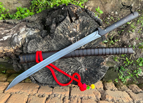 户撒刀简介:这款刀是客户提供影视原型,一把僵尸马刀,刀条是百炼花纹钢一体全龙骨手工锻造结实耐用,这款刀流线优美非常养眼,刀条锻打淬火后性能极佳,削纸的情况下可以砍铁丝,配黑酸枝刀柄刀鞘,这款刀相对轻便,方便携带,平时锻炼和户外都非常给力!