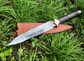 户撒刀简介:小短剑采用户撒红钢手工锻造,剑身流畅美观性能极佳,轻松削纸,穿刺能力也非常突出,护手采用实心纯铜手工磨制,非常有特点,这把短剑一经推出非常受客户欢迎,经常接二连三的定制,大家欣赏!