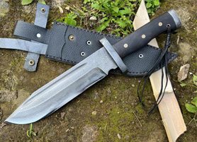 户撒刀简介:这是户撒锻打工艺下一把非常厚实的大猎刀,采用特硬花纹钢一体龙骨锻打刀条,刀身非常厚实,厚度达到1厘米左右,户外带着它安全感爆棚,感觉能应付各种突发情况!此刀筋骨强悍,性能极佳,铁血壮汉专用!