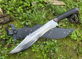 户撒刀简介:此刀采用户撒优质红钢全手工锻造,一体龙骨设计结实耐用,刀型极具震撼力,重心靠前劈砍力度极大,手柄精缠刀绳,防滑手感出众,户外开山一刀在手峥嵘尽显!