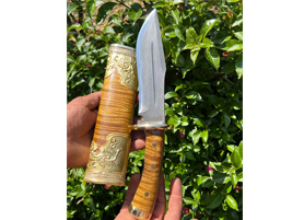 商品简介:这款大猎刀造型威猛采用特硬百炼花纹钢手工锻打,性能极佳,劈砍穿刺都非常出色,手柄和刀鞘采用优质阴沉金丝楠木手工制作,护手和尾端都为实心纯铜手工制作打磨,刀鞘外包黄铜,充满皇家质感,让人爱不释手!