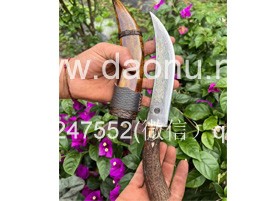 户撒刀简介:户撒刀非物质文化传人杨茂芳采用扭转纹大马士革手工锻造而成,刀身造型独特精美,刀身独有的户撒走铜工艺,刀柄采用原生鹿角制作,刀鞘为优质金丝楠木手工制作外缠丝,一把非常精致漂亮并且实用的小弯刀!