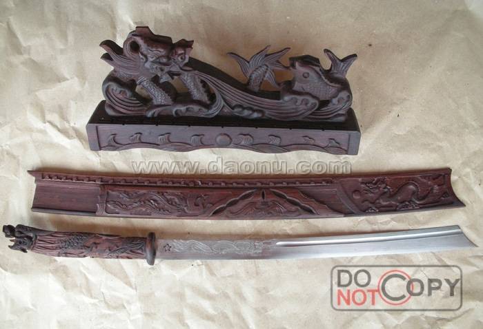 产品介绍: 此刀为刀王师弟,新一代打刀人中最有天赋的江齐精心打制,刀身才采用德国进口钢材,刀刃硬度高,可砍铁不伤,刀条精刻双龙图案,全长94CM*刀长75CM*刀把24CM*刀宽4CM*刀厚0.8CM;乌酸枝木龙头刀把,乌酸枝木龙凤刀壳;(2008年最新款,此精品收藏版配有同木料乌酸枝木精雕刀座)